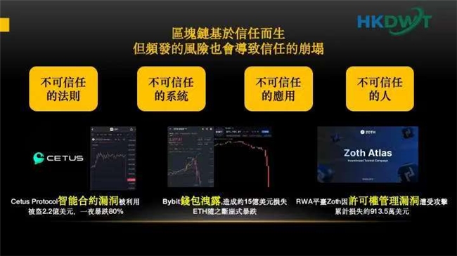 蔡晶晶在演讲中指出,信任是Web3.0存在的根本理由和最高追求,而数字化是Web3.0的根基和动力。作为面向未来的互联网新形态,Web3.0 本应围绕 “可信的数字交互、价值流转与交换” 构建生态。然而,现实中的Web3.0世界却因不可信任的法则、不可信任的系统、不可信任的应用和不可信任的人而频发安全事件,严重威胁着用户资产安全和行业信任根基。